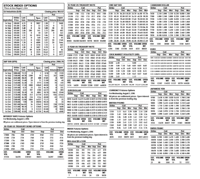 Stock Options Pices at cose August 3, 206 ExxonMobil Underlying stock price: $8749 Call Put Last Sale Last Sale Strike Open interest 2042 Expiration 16 Aug 16 Aug 16 Sep 16 Sep 16 Oct 16 Oct Price Volume Volume Open interest 87.00 L13 56 1.26 22 861 87.50 20 4265 1.63 16825 85.00 3.20 2103 22 20 536 1.33 20 87.50 167 2.50 4700 2.32 197 1561 87.50 TI40 3.10 3853 13 10 90.00 1.37 16859 4.95 4398 17 Jan 87.50 5.50 520 8.92 140 17 Jan 90.00 4.28 649 6.50 11.66 12.45 507 18 Jan 8750 7.42 1910 1820 18 Jan 90.00 6.17 5239 2369 10 YEAR US TREASURY NOTE CME SAP SOo CANADIAN DOLLAR STOCK INDEX OPTIONS Pices at close Augr 1, 2016 DJ Industrials (DD) Strike Call Put Sep oct Dec Sep Ooct Dec 13100 148 122 130 11 045 Call Strike Put Sep Dec Mar Sep Dec Mar 2130 51.70 20 11020 2470 6690 97.0 7450 2210 2.9O 3330 0230 0RO 1300 Call Put Strike Sep Dec Mar Sep Dec Mar Clesing price: 18357 109 Call Put 13150 122 103 133 O17 Os8 124 2135 4810 82.90 107.10 26.10 68.50 9950 7500 LA00 254) 3000 030 1040 LE0 Strike Last Open Last Open 13200 063 0SI F18 76 rio 141 2140 44.60 60 103.00 27.60 7020IOL30 7530 13250 044 38 I04 039 29 15 2145 41.20 76.40 100.K5 29.20 72.00 103.20 7600 13300 029 028 056 56 ISI 71S 2150 37.80 73.20 97.70 300 73D 10S.10 450 aaD 1AS0 2110 as0 164D 200 13350 O18 20 046 1'IS ZII 7I7 13400 011 14 037 1'38 77 2w0 2160 31.40 67.00 91.60 34.40 71.601ONL0 7I30 0410 1.180 1630 LA0 2.l60 2.90 13450 007 Vi0 030 2202 T01 321 2165 28.40 64.00 38.60 3640 7940I10.95 7O0 L430 220 260 GASO 1210 L6S0 Expiration Price Sale Volume Interest Sale Volume Interest 16 Sep 18000 16 Sep I81.0 3.8 16 Sep 16 Sep 183.00 16Sep 16Sup LIO 1.920 23300 GA20 LA0 L0 4.55 S07 22 1.90 2.58 3.0 S440 72 12 2155 3450 70.10 9400 3250 757010630 700 a.590 1400 180 L110 1990 230 18200 340 16 30 2.80 280 141 2.75 280 485 184.00 1.95 10 162 020 090 L420 100 2460 280 185.00 18600 EST. VOLUME OPEN EST. VOLUME OPEN 2170 25.30 6l.10 5.0 38.50 160113.00 70 VOL QID OSI0 12130 2200 2701190 2175 22 0 S20 8285 40.0 3.70115.10 EST. VOLUME OPEN EST. VOLUME OPEN 1.52 10 1819 204 4.60 45 6 Sup INT VOL NT 16 Dec 17500 1.53 18000 185.00 16 Dec 190.0 16 Dec 195.00 0.74 17 Dec 170.00 20.37 17 Dec 180.00 14.65 397 481 106300 10633 S758 I29 D 2I0 20.30 55.40 79.90 43.30 8590117.10 VOL NT VOL INT l6 Dec 7.30 535 EST. VOLUME OPEN EST. VOLUME OPEN 1504 122 IRSOD 1387 I6 Dec 122 1234 3487 1630 3525 715 345 427 Vol INT VOL 294 3380 131784 3419 INT 4535 0 9.30 SYEAR US TREASURY NOTE 99 34.61 46 Strke Call Put EURO Call 10.44 1451 Sep oct Dec Sep oct Dec 2072 Strike Sep Dec Mar Sep Dec Mr S a a ae se e are Put 2104 1977 12050 1275 I' r45 ouns g1os oas CHOE MARKET VOLATILITY (VDO 12075 0125 1220 355 o0MS 0130 0265 Shike Call Put Sep Oct Dec Sep Oct Dec 12100 0625 100s 1240 OKS Ol6s 0310 SAP 500 (SPX) Closing price: 2166.70 12125 0495 615 FI0 Ous 20s wO 1000 12150 0375 50s rO 135 255 40 1L00 12175 0270 0410 S0 190 0 0 12.00 12200 0185 (7330 0500 024S o0 0s0 13.00 12225 0120 0255 425 owo OS 1015 14.00 12250 0075 0195 0355 o47S OS I'IO5 15.00 - 000 530 7.10 7.60 a0s aas aas 6.40 s aIT mm a se e me Call Put Strike Last Open Last Sale Volumelnteres Open IIS aI S a ee e 4.40 6.10 6.e a10 a10 aIS 3.50 5.29 590 032 020 031 3.00 4.50 520 0AS 047 a0 2.45 Expiration Price Sale Volume ltret 16 Sep 2090.00 73.25 16 Sep 2100.00 2500 16 Sep 2125.00 .35 16 Sep 2145.00 140 Sep Sop 2175 I1 R aS ZIe e 52 1319 262 14 965 - LIS 29 100 17.85 927 EST. VOLUME OPEN EST. VOLUME OPEN 10 74 EST. VOLME OPEN EST. VOLUME OPEN EST. VOLUME OFEN EST. VOLUME OPEN 20 71 21.80 VOL INT VOL INT 22 STI3 22.90 145 VOL INT VOL INT VOL INT VOL NT 17.20 1000 35 148 40.9 S174 l9 191R9 2298 1307 i I IIra 38I 12187 11412 1I7 1079 1418 44.30 6455 3870 45 RS 351 403 1463 970 JAPANESE YEN Sep 2210 442 1384 EURODOLLAR CURRENCY Futures Options Call Sep Dec Mar Sep Dec Ma 70.10 10 Strike Put Stike For Wedsctay. Aget 3, 20NG Call Sep Dec Mar Sep Dec Mar Al prices are sotiument prices. Opon intrit 00 24D LID SO0 610 1790224 Put 16 Oct 2150.00 53.0 S15 21719 1316 16 Oct 16 Oct 16 Oct 46. N 154 48.00 QAsa OASO DAZ7S QASIS OSIS OS7S0 aS90m ktom the provious trading day Q 500 05e0 0.ARSO GARIS 0.0 04975BRITISH POUND 2200.00 25.00 1004 2250.00 7.90 16 Dac 2025.00 .0 16 Doc 2125.00 0.10 16 Dec 2175.00 9.15 16 Dec 2300.00 45.05 1103 72.15 4 290 2170 250 S 9790 2.290 3R80 4730 070 1990240 9800 1.990 3.610 40 00 2210260 9850 1.710 3340 4190 1.190 24502900 9900 20 29030 24 36 30.95 9875 04150 0385 0300 038IS 0.925 D4130 Call Sep Dec Mar Sep Dec Mar Strike Put 1248 213I5 S.0 41739 960 64.45 9A87 0.2915 03675 02675 0305 03150 03375 9900 0.100 0.16m 0.1800 0.275 02450 02700 L40 3.100 3940 1.440 27001190 1310 1.20 280 17IO 1.730 29703410 3.13 461 5.59 ON 214 2. 2.45 398 496 L20 250 3.26 130 0000 L000 240 30 2.00 1 0 INTEREST RATE Futures Options For Wechesdy. Agat 1, 20 Al picem are settlomert prices. Open interest om the previcn trading day. L6 140 438 Lal 292 367 EST. VOLUME OPEN EST. VOLUME OPEN EST. VOLUME OPEN EST. VOLUME OPEN 1340 1350 1.37 287 383 2.12 339 4.12 098 241 333 273 392 442 0.68 200 288 343 451 5.16 046 165 24S 421 S.16 5.36 SWISS FRANC NT VOL VOL 334 INT VOL NT VOL INT 30. YEAR US TREASURY BOND OPTIONS Cll 130 INDEX Futures Options For Wadnestay, Auget3, 205 Al prices aro sottioment prices. Open intorest is VOL from the provious trading day. Strike Sep Put EST. VOLUME OPEN EST. VOLLME OPENStrike INT VOL 3525 9879 5457 Put Sep Dec Mar Sep Dec M Call Oct Dec Sep Oct Dec 17000 306 304 428 222 346 INT 3015 612 10400 a990 L840 2670 LA00 2.290 2600 17100 228 234 4'14 J0M50 0A0 1630 2450 1.970 2.590 20 204 330 322 448 Mini-stzed $5 x DJIA OS00 ao L440 230 2.370 2900 310 10550 020 1280 2.050 2.790 3230 340 170 125 2'15 521 Strike Call Put 17400 100 122 254 Sep Dec Mar Sep Dec Mar 91 7I5 255 617 S9 S61 746 276 437 S3I 716 291 57 20 1000 020 1130 1.0 3230 1580 1800 1700 45 221 35 638 1800 324 1O50 Q10 L000 L720 360 190 4.10 EST. VOLUME OPEN EST. VOLUME OPEN 18290 292 00 a140 a0 1.S0 4.150 4340 4490 VOL INT 22RS45 VOL 304