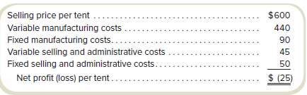> Nardin Outfitters has the capacity to produce 12,000 of its special arctic tents per year. The company is currently producing and selling 5,000 tents per year at a selling price of $900 per tent. The cost of producing and selling one tent follows: The co