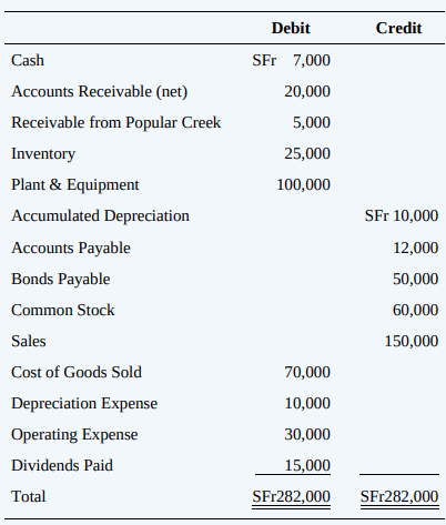 Debit Credit Cash SFr 7,000 Accounts Receivable (net) 20,000 Receivable from Popular Creek 5,000 Inventory 25,000 Plant & Equipment 100,000 Accumulated Depreciation SFr 10,000 Accounts Payable 12,000 Bonds Payable 50,000 Common Stock 60,000 Sales 150,000 Cost of Goods Sold 70,000 Depreciation Expense 10,000 Operating Expense 30,000 Dividends Paid 15,000 Total SFF282,000 SFr282,000
