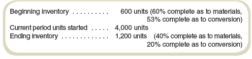 600 units (60% complete as to materlals, 53% complete as to conversion) Beginning inventory ... Current period units started Ending inventory . 4,000 units 1,200 units (40% complete as to materials, .. .. 20% complete as to conversion)