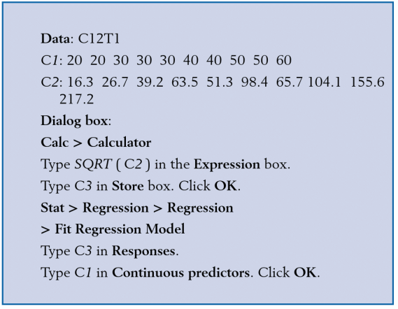 Refer to the data of speed x and stopping distance y given in Table I. The MINITAB commands for fitting a straight line regression to yâ = ây and x are