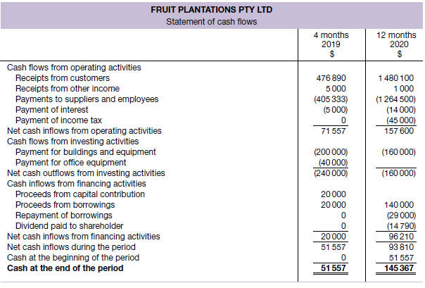 Cash flows from operating activities Receipts from customers FRUIT PLANTATIONS PTY LTD Statement of cash flows Receipts from other income Payments to suppliers and employees Payment of interest Payment of income tax Net cash inflows from operating activities Cash flows from investing activities Payment for buildings and equipment Payment for office equipment Net cash outflows from investing activities Cash inflows from financing activities Proceeds from capital contribution Proceeds from borrowings Repayment of borrowings Dividend paid to shareholder Net cash inflows from financing activities Net cash inflows during the period Cash at the beginning of the period Cash at the end of the period 4 months 2019 476 890 5 000 (405 333) (5 000) 0 71 557 (200 000) (40000) (240 000) 20000 20 000 0 0 20 000 51 557 0 51 557 12 months 2020 1480 100 1000 (1 264 500) (14000) (45000) 157 600 (160 000) (160 000) 140 000 (29 000) (14 790) 96210 93 810 51 557 145 367