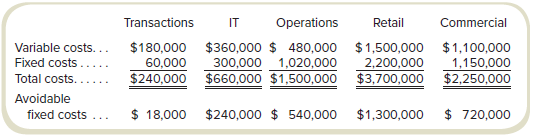 > Dunedin Bank has two operating departments (Retail and Commercial) and three service departments: Operations, Information Technology (IT), and Transactions. For the last period, the following costs and service department usage ratios were recorded: Requi