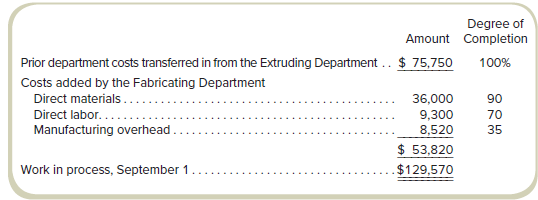 Required a. Prepare a production cost report for September using the weighted-average method. b. Management would like to decrease the costs of manufacturing the parts. In particular, it has set the following per-unit targets for this product in the Fabricating Department: Materials, $2.80; labor, $0.90; and manufacturing overhead, $0.55. Has the product achieved management’s cost targets in the Fabricating Department? Write a short report to management stating your answer(s).