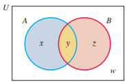 > Refer to the following Venn diagram. Which of the numbers x, y, z, or w must equal 0 if A ∪ B = U?