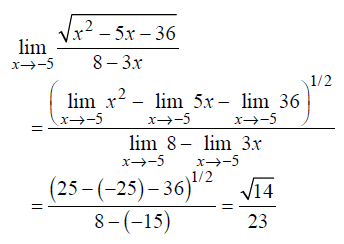 Vx2 – 5x – 36 lim x-5 8- 3х 1/2 lim x? - lim 5x - lim 36 x→-5 (x→-5 x→-5 lim 8- lim 3x x→-5 1/2 x-5 (25 – (-25)– 36)“² _ Vī4 8-(-15) V14 23