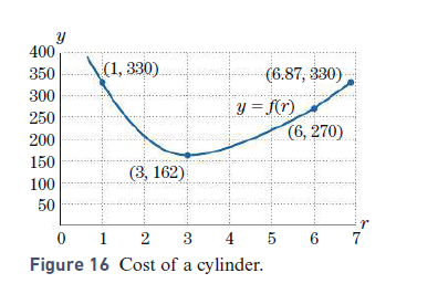 400 (1, 330) (6.87, 330) 350 300 y = f(r) (6, 270) 250 200 150 (3, 162) 100 50 1 2 3 4 5 6 7 Figure 16 Cost of a cylinder.