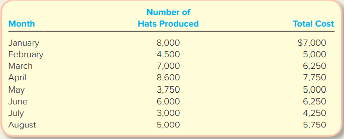 Refer to the Handyâs Hats data in M5â13. Using the high-low method, calculate the total fixed cost per month and the variable cost per hat. How does the estimate of fixed cost compare to what you estimated in M5â13?