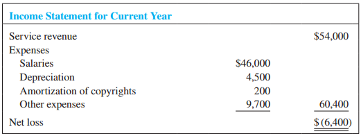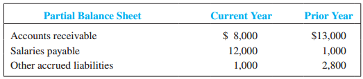 Income Statement for Current Year Service revenue $54,000 Expenses Salaries $46,000 Depreciation Amortization of copyrights Other expenses 4,500 200 9,700 60,400 Net loss $(6,400) Partial Balance Sheet Current Year Prior Year Accounts receivable $ 8,000 $13,000 Salaries payable 12,000 1,000 Other accrued liabilities 1,000 2,800