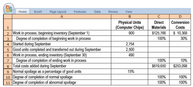 Home Insert Page Layout Formulas Data Review View A В D Conversion Physical Units (Computer Chips) Direct 1 Materials Costs 2 Work in process, beginning inventory (September 1) Degree of completion of beginning work in process 4 Started during September 5 Good units completed and transferred out during September 6 Work in process, ending inventory (September 30) Degree of completion of ending work in process 8 Total costs added during September 9 Normal spoilage as a percentage of good units 10 Degree of completion of normal spoilage 11 Degree of completion of abnormal spoilage $ 10,368 30% 900 $125,766 100% 2,754 2,500 490 7 100% 10% $619,650 $253,098 15% 100% 100% 100% 100%