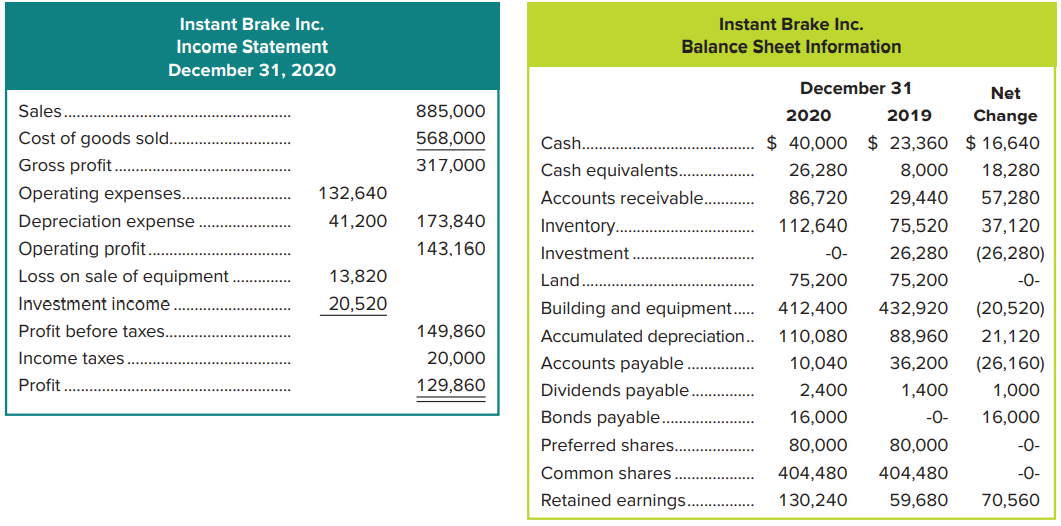 > Instant Brake Inc.’s comparative balance sheet information at December 31, 2020 and 2019, and its income statement for the year ended December 31, 2020, are as follows: During 2020, the following transactions occurred: 1. Purchased equi