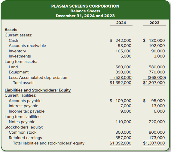 > The balance sheets for Plasma Screens Corporation, along with additional information, are provided below: Additional Information for 2024: 1. Net income is $79,000. 2. The company purchases $110,000 in equipment. No eq