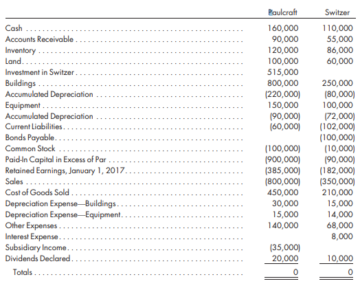 Paulcraft Switzer Cash 160,000 90,000 120,000 100,000 515,000 800,000 (220,000) 150,000 Accounts Receivable Inventory Land. 110,000 55,000 86,000 60,000 Investment in Switzer. Buildings . Accumulated Depreciation Equipment . Accumulated Depreciation Current Liabilities. 250,000 (80,000) 100,000 (72,000) (102,000) (100,000) (10,000) (90,000) (182,000) (350,000) 210,000 15,000 14,000 68,000 8,000 (90,000) (60,000) Bonds Payable. Common Stock (100,000) (900,000) Paid-In Capital in Excess of Par Retained Earnings, January 1, 2017. Sales (385,000) (800,000) 450,000 30,000 15,000 140,000 Cost of Goods Sold Depreciation Expense Buildings. Depreciation Expense-Equipment. Other Expenses Interest Expense. Subsidiary Income. Dividends Declared. (35,000) 20,000 10,000 Totals.