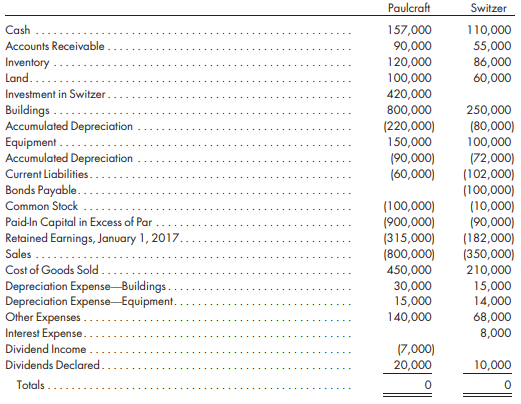 Refer to the preceding information for Paulcraftâs acquisition of Switzerâs common stock. Assume that Paulcraft pays $420,000 for 70% of Switzer common stock. Paulcraft uses the cost method to account for its investment in Switzer. Paulcraft and Switzer have the following trial balances on December 31, 2017: