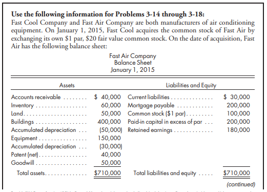 > Refer to the preceding information for Fast Cool’s acquisition of Fast Air’s common stock. Assume Fast Cool issues 25,000 shares of its $20 fair value common stock for 100% of Fast Air’s common stock.