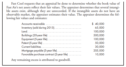 > Refer to the preceding information for Fast Cool’s acquisition of Fast Air’s common stock. Assume Fast Cool issues 35,000 shares of its $20 fair value common stock for 80% of Fast Air’s common stock.