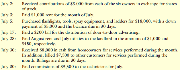 July 2: Received contributions of $3,000 from each of the six owners in exchange for shares of stock. Paid $1,000 rent for the month of July. July 3: July 5: Purchased flashlights, tools, spray equipment, and ladders for $18,000, with a down payment of $5,000 and the balance due in 30 days. Paid a $200 bill for the distribution of door-to-door advertising. July 17: July 28: Paid August rent and July utilities to the landlord in the amounts of $1,000 and $450, respectively. July 30: Received $8,000 in cash from homeowners for services performed during the month. In addition, billed $7,500 to other customers for services performed during the month. Billings are due in 30 days. July 30: Paid commissions of $9,500 to the technicians for July.