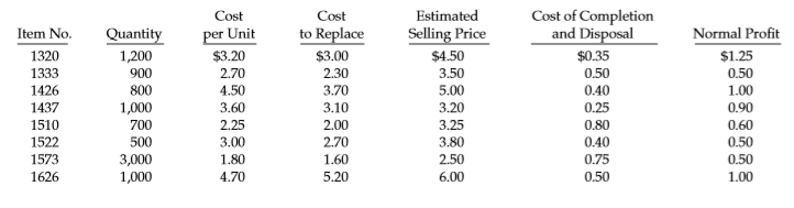 Cost of Completion and Disposal Cost Cost Estimated per Unit to Replace Selling Price Normal Profit Item No. Quantity 1320 1,200 $3.20 $3.00 $4.50 $0.35 $1.25 1333 900 2.70 2.30 3.50 0.50 0.50 1.00 1426 800 4.50 3.70 5.00 0.40 3.60 2.25 3.00 1437 1,000 3.10 3.20 0.25 0.90 2.00 0.80 0.40 0.60 0.50 1510 700 1522 1573 1626 3.25 3.80 2.50 500 2.70 3,000 1,000 1.80 1.60 0.75 0.50 4.70 5.20 6.00 0.50 1.00 Cost to Complete and Sell Cost Estimated per Unit Selling Price Item No. Quantity 1320 1,200 $3.20 $4.50 3.40 5.00 3.20 3.25 3.90 $1.60 1333 900 2.70 1.00 1.40 1426 1437 800 1,000 700 4.50 3.60 2.25 3.00 1.35 1.40 0.80 1510 1522 500 3,000 1,000 1573 1.80 2.50 1.20 1626 4.70 6.00 1.50