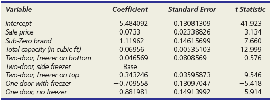 Variable Coefficient Standard Error t Statistic Intercept Sale price Sub-Zero brand Total capacity (in cubic ft) Two-door, freezer on bottom Two-door, side freezer Two-door, freezer on top One door with freezer 5.484092 0.13081309 41.923 -0.0733 0.02338826 -3.134 1.11962 0.14615699 7.660 0.06956 0.00535103 12.999 0.046569 0.0808569 0.576 Base -0.343246 0.03595873 -9.546 -0.709558 0.13097047 -5.418 One door, no freezer -0.881981 0.14913992 -5.914