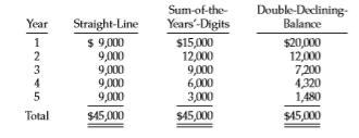 Sum-of-the- Double-Declining- Balance Year Straight-Line $ 9,000 9,000 9,000 9,000 9,000 Years'-Digits 1 $15,000 12,000 9,000 6,000 3,000 $20,000 12,000 7200 4,320 1,480 Total $45,000 S45,000 $45,000 234