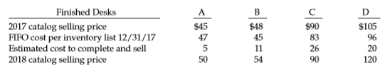 Finished Desks A 2017 catalog selling price FIFO cost per inventory list 12/31/17 Estimated cost to complete and sell 2018 catalog selling price $45 $48 $90 $105 47 45 83 26 90 96 20 11 50 54 120