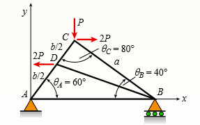 Find support reactions at A and B and then use the method of joints to find all member forces. Let b = 3 m and P = 80 kN.