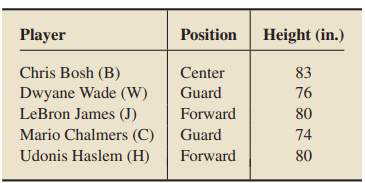 > The winner of the 2012–2013 National Basketball Association (NBA) championship was the Miami Heat. One possible starting lineup for that team is as follows. a. Find the population mean height of the five players. b. For samples of size 2, construct a tab