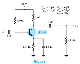 > Repeat Problem 15 for the common-base configuration of Fig. 9.83. Keep in mind that the common-base configuration is a noninverting network when you consider the Miller effect.