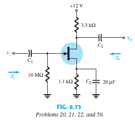 > Determine Zi, Zo, and Av for the network of Fig. 8.73 if the 20@mF capacitor is removed and the parameters of the network are the same as in Problem 20. Compare results with those of Problem 20.