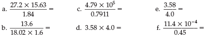 27.2 x 15.63 а. 4.79 x 105 с. 3.58 е. 4.0 1.84 0.7911 11.4 x 10-4 f. 13.6 b. 18.02 x 1.6 d. 3.58 x 4.0 = 0.45