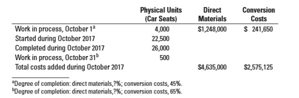 Direct Physical Units (Car Seats) 4,000 Conversion Materials Costs Work in process, October 1ª Started during October 2017 Completed during October 2017 Work in process, October 31 Total costs added during October 2017 $1,248,000 $ 241,650 22,500 26,000 500 $4,635,000 $2,575,125 *Degree of completion: direct materials,?%; conversion costs, 45%. "Degree of completion: direct materials,?%; conversion costs, 65%.