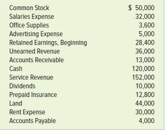 $ 50,000 32,000 3,600 5,000 Common Stock Salaries Expense Office Supplies Advertising Expense Retained Earnings, Beginning 28,400 36,000 13,000 120,000 152,000 10,000 12,800 44,000 30,000 4,000 Unearned Revenue Accounts Receivable Cash Service Revenue Dividends Prepaid Insurance Land Rent Expense Accounts Payable
