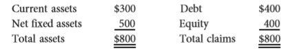 Current Assets $300 Debt $400 Net fixed assets 500 Equity 400 Total assets $800 Total claims $800