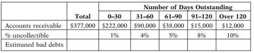 Number of Days Outstanding Total 0-30 31-60 61-90 91-120 Over 120 Accounts receivable $377,000 $222,000 $90,000 $38,000 $15,000 % uncollectible $12,000 1% 4% 5% 8% 10% Estimated bad debts