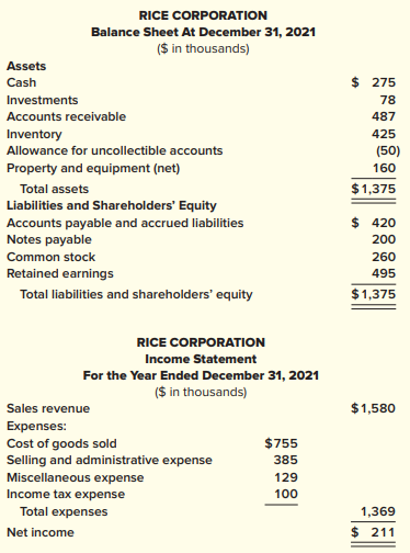 Rice Corporation is negotiating a loan for expansion purposes and the bank requires financial statements. Before closing the accounting records for the year ended December 31, 2021, Riceâs controller prepared the following financial statements: