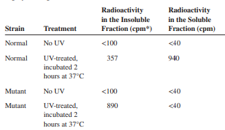 Radioactivity in the Insoluble Fraction (cpm") Radioactivity in the Soluble Fraction (cpm) Strain Treatment Normal No UV <100 <40 Normal UV-treated, 357 940 incubated 2 hours at 37°C Mutant No UV <100 <40 Mutant UV-treated, 890 <40 incubated 2 hours at 37°C