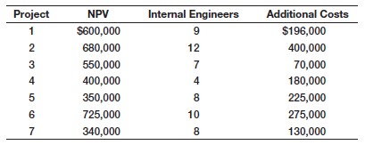 Riesemberg Medical Devices is allocating next yearâs budget among its divisions. As a result, the R&D Division needs to determine which R&D projects to fund. Each project requires various software and hardware and consulting expenses, along with internal human resources. A budget allocation of $1,300,000 has been approved, and 35 engineers are available to work on the projects. The R&D group has determined that at most one of projects 1 and 2 should be pursued, and that if project 4 is chosen, then project 2 must also be chosen. Develop a model to select the best projects within the budget.