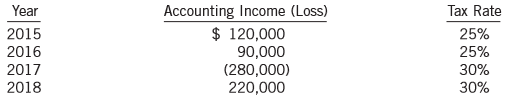 Accounting Income (Loss) $ 120,000 90,000 (280,000) 220,000 Year Tax Rate 2015 25% 2016 25% 2017 30% 2018 30%
