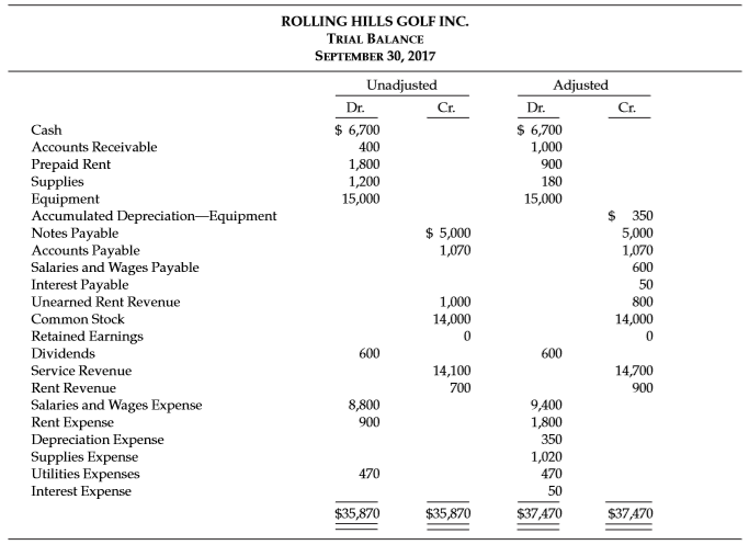 ROLLING HILLS GOLF INC. TRIAL BALANCE SEPTEMBER 30, 2017 Unadjusted Adjusted Dr. Cr. Dr. Cr. $ 6,700 $ 6,700 1,000 Cash Accounts Receivable 400 1,800 1,200 15,000 Prepaid Rent Supplies Equipment Accumulated Depreciation-Equipment Notes Payable Accounts Payable Salaries and Wages Payable Interest Payable Unearned Rent Revenue Common Stock 900 180 15,000 $ 5,000 1,070 $ 350 5,000 1,070 600 50 1,000 14,000 800 14,000 Retained Earnings Dividends 600 600 Service Revenue 14,100 14,700 Rent Revenue 700 900 Salaries and Wages Expense Rent Expense Depreciation Expense Supplies Expense Utilities Expenses Interest Expense 8,800 9,400 1,800 900 350 1,020 470 470 50 $35,870 $35,870 $37,470 $37,470