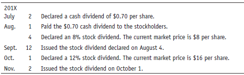 201X July 2 Declared a cash dividend of $0.70 per share. Aug. 1 Paid the $0.70 cash dividend to the stockholders. 4 Declared an 8% stock dividend. The current market price is $8 per share. Sept. 12 Issued the stock dividend declared on August 4. Oct. 1 Declared a 12% stock dividend. The current market price is $16 per share. Nov. Issued the stock dividend on October 1.