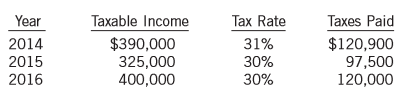 Year Taxable Income Tax Rate Taxes Paid $390,000 325,000 400,000 $120,900 97,500 120,000 2014 31% 2015 30% 2016 30%