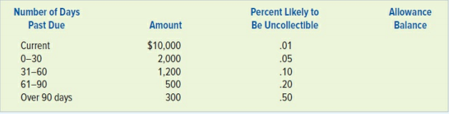 Number of Days Percent Likely to Be Uncollectible Allowance Past Due Amount Balance Current $10,000 .01 0-30 2,000 1,200 500 .05 31-60 .10 61-90 .20 Over 90 days 300 .50