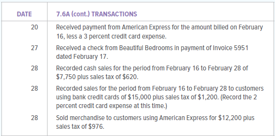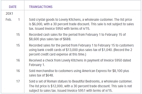 Royal Gift Shop sells cards, supplies, and various holiday greeting cards. Sales to retail customers are subject to an 8 percent sales tax. The firm sells its merchandise for cash; to customers using bank credit cards, such as MasterCard and Visa; and to customers using American Express. The bank credit cards charge a 2 percent fee. American Express charges a 3 percent fee. Royal Gift Shop also grants trade discounts to certain wholesale customers who place large orders. These orders are not subject to sales tax. During February 20X1, Royal Gift Shop engaged in the following transactions: