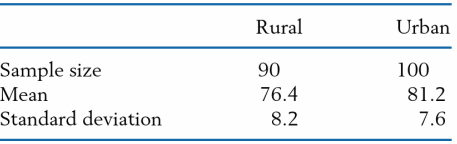 Rural and urban students are to be compared on the basis of their scores on a nationwide musical aptitude test. Two random samples of sizes 90 and 100 are selected from rural and urban seventh grade students. The summary statistics from the test scores are