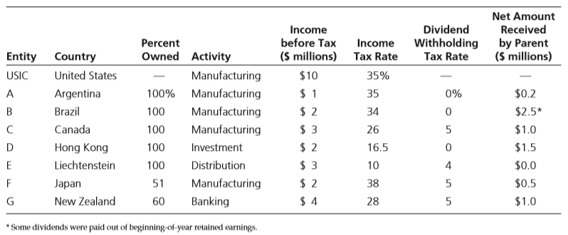 Net Amount Dividend Withholding Tax Rate Received by Parent ($ millions) Income Percent before Tax Income Entity Country Owned Activity ($ millions) Tax Rate USIC United States Manufacturing $10 35% $ 1 $ 2 A Argentina 100% Manufacturing 35 0% $0.2 B Brazil 100 Manufacturing 34 $2.5* $ 3 $ 2 Canada 100 Manufacturing 26 5 $1.0 D Hong Kong 100 Investment 16.5 $1.5 $ 3 $ 2 E Liechtenstein 100 Distribution 10 4 $0.0 F Japan 51 Manufacturing 38 5 $0.5 New Zealand 60 Banking $ 4 28 $1.0 Some dividends were paid out of beginning-of-year retained earnings.