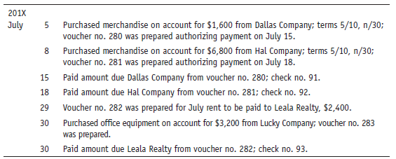 201X July Purchased merchandise on account for $1,600 from Dallas Company; terms 5/10, n/30; voucher no. 280 was prepared authorizing payment on July 15. 5 Purchased merchandise on account for $6,800 from Hal Company; terms 5/10, n/30; voucher no. 281 was prepared authorizing payment on July 18. 8 15 Paid amount due Dallas Company from voucher no. 280; check no. 91. 18 Paid amount due Hal Company from voucher no. 281; check no. 92. 29 Voucher no. 282 was prepared for July rent to be paid to Leala Realty, $2,400. Purchased office equipment on account for $3,200 from Lucky Company: voucher no. 283 was prepared. 30 30 Paid amount due Leala Realty from voucher no. 282; check no. 93.