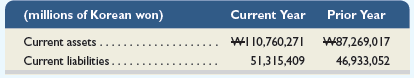 (millions of Korean won) Current Year Prior Year Current assets. WI 10,760,271 W87,269,017 Current liabilities.. 51,315,409 46,933,052