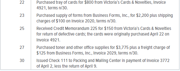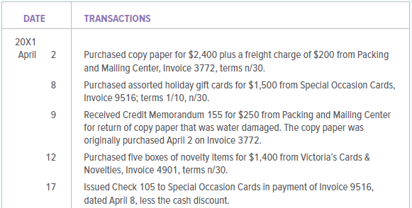 Sarahâs Card and Supplies Shop is a retail card, novelty, and business supply store. Sarahâs Card and Supplies Shop commenced business on April 1, 20X1. The firm purchases merchandise on open account. The firmâs purchases, purchase returns and allowances, and cash payments on account during April 20X1 follow: