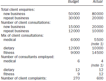 Budget Actual Total client enquiries: new business repeat business 50000 30000 80000 20000 Number of client consultations: new business 15000 20000 repeat business Mix of client consultations: 12000 10000 medical 6000 5500 (note 1) 10000 dietary fitness Number of consultants employed: medical 12000 9000 14500 6. 4 (note 1) dietary fitness 12 12 9 12 Number of client complaints: 270 600