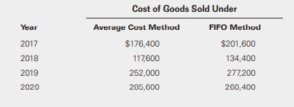 Second Thought Products (STP) began operations on January 1, 2017, and adopted the FIFO method of inventory valuation at that time. Management elected to change its inventory method to the average-cost method effective January 1, 2020. The new method more fairly presents the companyâs financial position and results of operations. The following information is available for the years ended December 31, 2017, through December 31, 2020. STP is subject to a 40% income tax rate. The company still uses the FIFO method for income tax reporting.